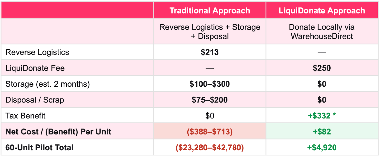 Comparing traditional reverse logistics against LiquiDonate’s donation model reveals significant financial advantages, especially with the tax benefit available under IRS Section 170(e)(3) for C-Corporations donating to qualified nonprofits.